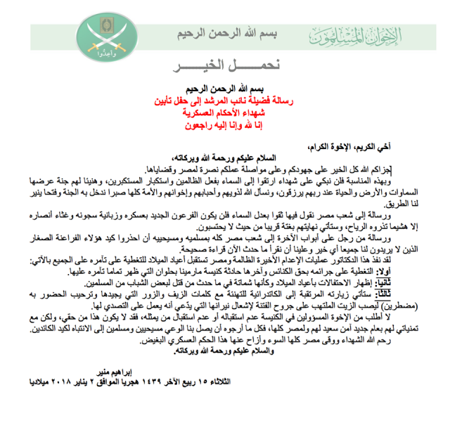ووجّه «إبراهيم» رسالة إلى المصريين، مسلمين ومسيحيين، طالبهم فيها بالاتحاد ضد نظام عبدالفتاح السيسي جاء نصها كالتالي: